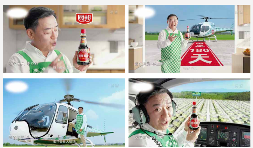 In the commercial for ChuBang, you can see the "green checker" from the first shot to the last shot. Not only on the packaging, but also on the end panel of the last shot, we also let Mr. Li Liqun wear a green checker apron to continue to build up the brand equity of the "green checker" super sign.