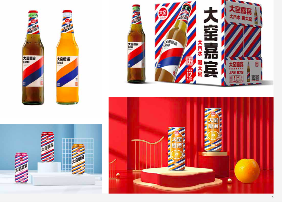 As a fast-moving consumer goods (FMCG) brand, the strategic focus of Dayao Beverage lies in product packaging. The product symbol of FMCG is the primary symbol of the brand. Building a brand symbol system on the product helps to accumulate brand equity. Hua & Hua discovered that the striped pattern has been consistently inherited in the packaging evolution of Dayao's core product, Dayao Jiabin, over the past 38 years. Therefore, Hua & Hua's goal is to continuously invest in the red and blue striped pattern and transform it into a super strategic pattern. The geometric, precise, uniform, and repetitive visual form can unleash tremendous psychological and social energy. Hua & Hua refines the pattern, increases its density, and adds a white stripe, forming a tricolor pattern of red, blue, and white. The density of the stripes is proportioned based on the colors of the French flag (red, blue, and white), creating the Dayao Beverage's super pattern: red, blue, and white striped pattern.