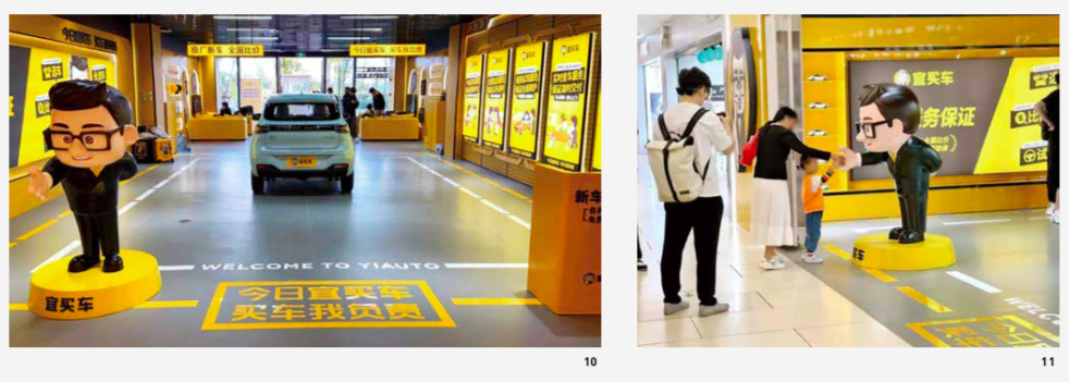 5. In-store electronic screens + lightbox posters, reflecting the value of services and sales information. Vehicle information is presented in a format similar to a stock exchange, displaying more comprehensive and direct information. Interactive electronic screens attract customer attention and increase their time spent in the store. Lightboxes display the car buying service steps provided by YIAUTO, reassuring customers during their store visit.