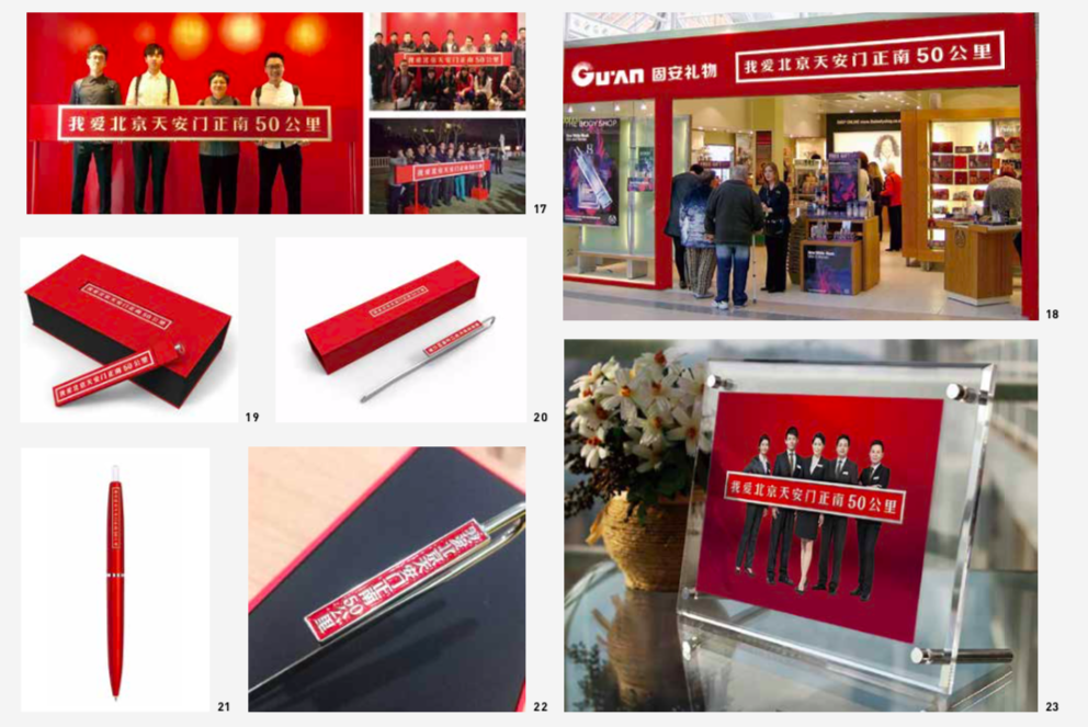 After leaving, we want visitors to take something that represents our city and brand, which can be continuously mentioned and discussed. We have developed a product called "Gu'an Gift" that is based on Gu'an's cultural, folk, historical, and industrial characteristics, which are integrated into the creative design of the gift, creating new media to promote and advertise Gu'an (figures 18-23).