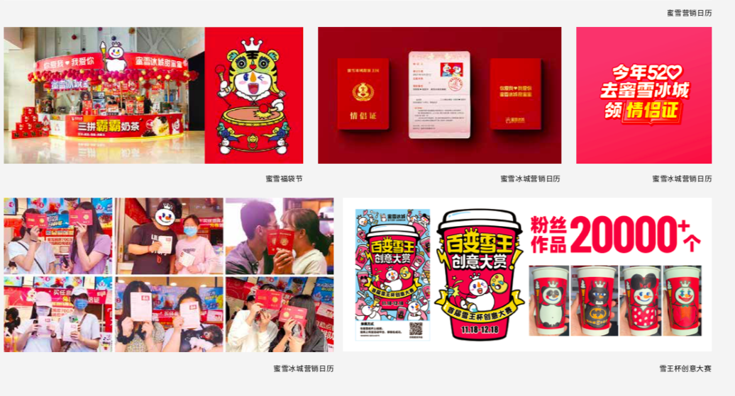 In January of each year, "MIXUE Lucky Bag Festival, bring luck home"; in May of each year, "This year's 520, go to MIXUE to get a couple's card"; in November of each year, "Multifaced Snow King Creative Award". Through the marketing calendar, a fixed marketing rhythm and theme were formed to continuously accumulate brand equity.
