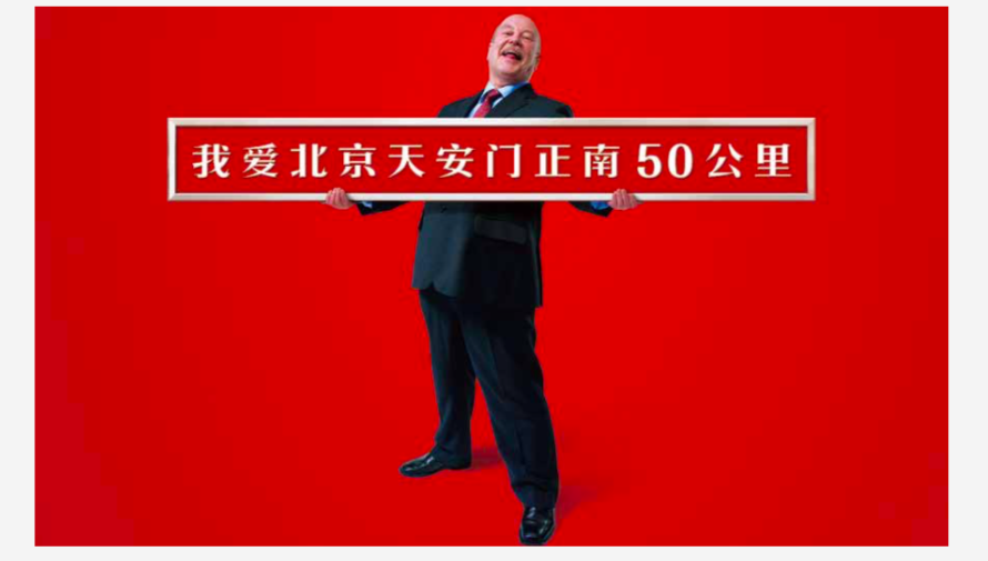 Advertising is the encoding of signs. We chose a Western man in a suit and a pair of leather shoes as the symbol of investors and entrepreneurs, holding a sign with the same format and font as the slogan on Tiananmen Square.