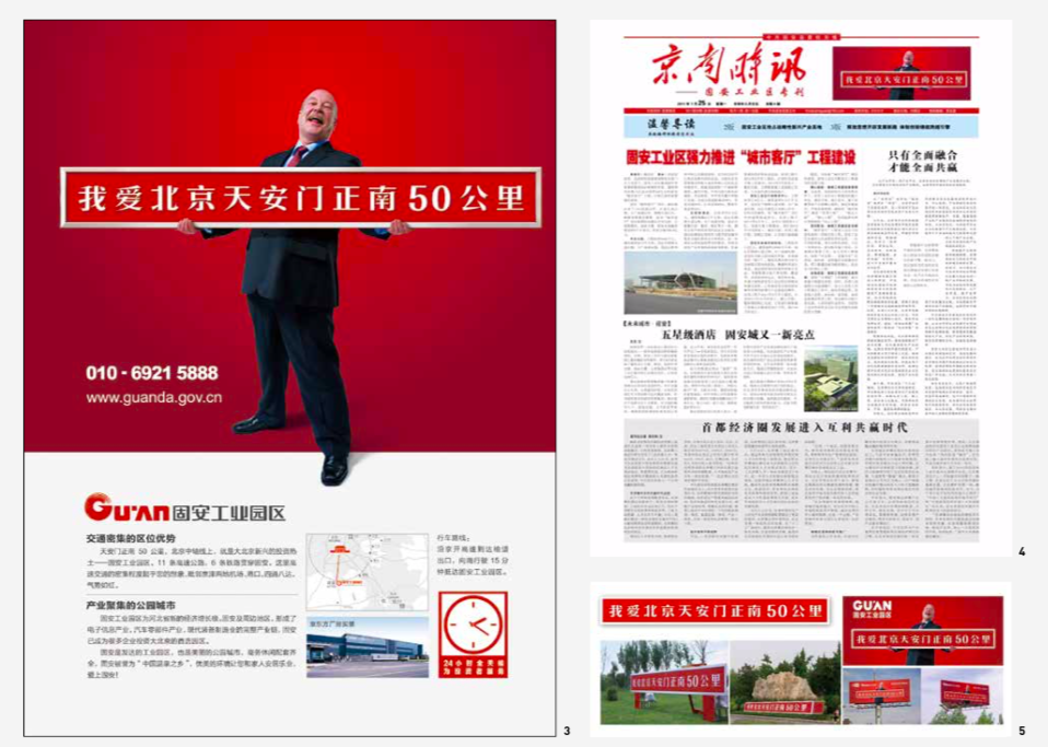 How can we make people be aware and excited about Gu'an, especially for potential investors before they arrive? We placed advertisements in the media they most frequently see, such as inflight magazines, state media, and at Beijing highway intersections. These ads played a crucial role in attracting investment and promoting the city brand during the early stage of park construction (Figure 3-5).